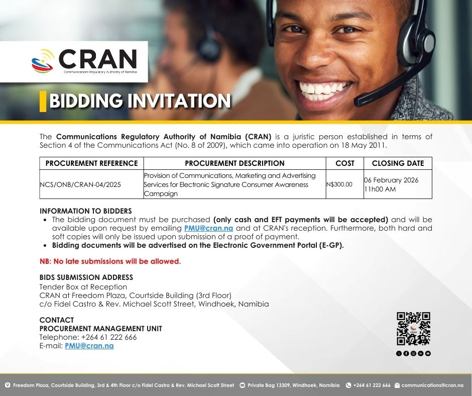 CRAN is mandated to grant, renew, amend, transfer, suspend and revoke licences in the areas of broadcasting and telecommunications service in Namibia.
